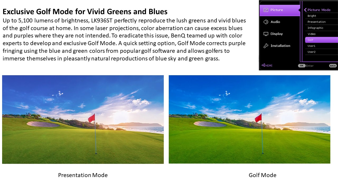 PicturePicture Modes3D, Bright, DICOM SIM, Golf, Infographic, Presentation, sRGB, User 1, User 2, Video