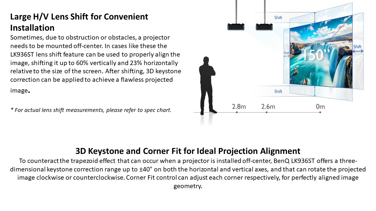 Keystone Adjustment3D, Vertical ± 40 degrees; Horizontal ± 40 degrees; Rotation ± 40 degrees