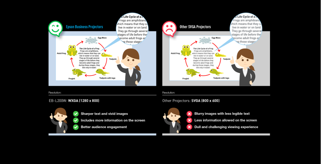 Epson’s unique laser technology sees the L200 series having 20,000 hours of maintenance-free laser light source. Users can share their content with confidence, thanks to the innovative fixed phosphor unit, giving your devices durability and long-lasting life.