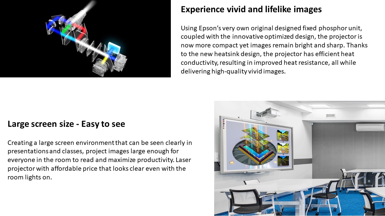 Bright, easy-to-read, lamp-free classroom display projects up to 381cm (150")