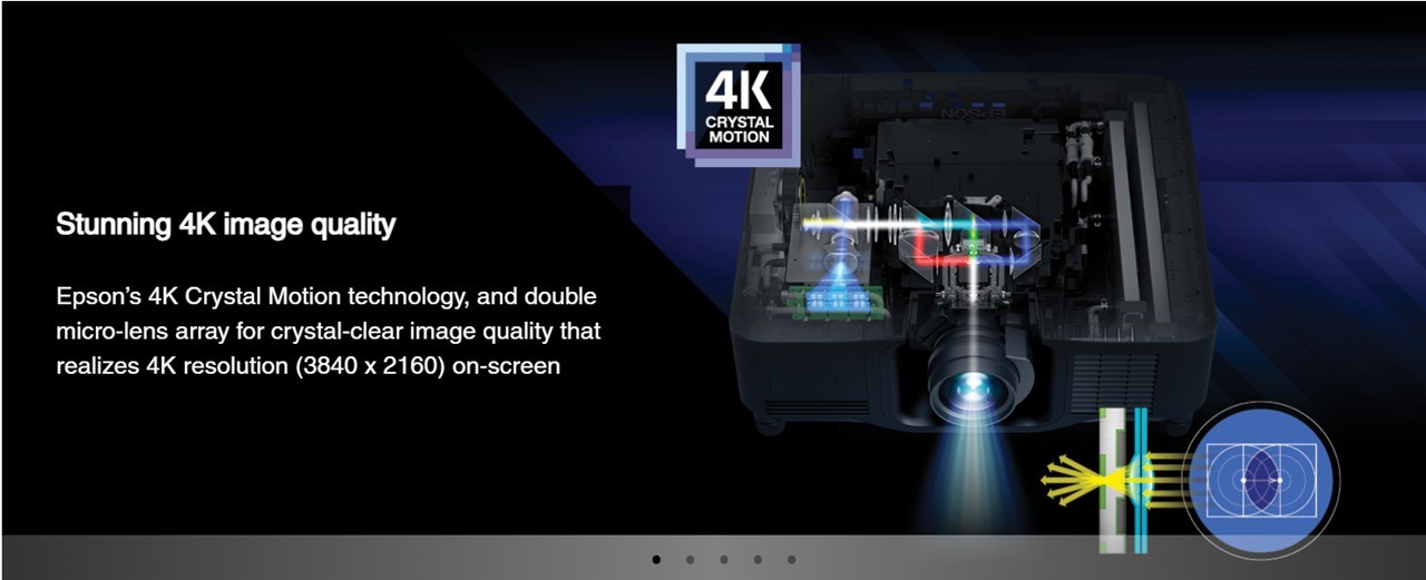 The EB-PQ2010B large venue 4K laser projector features the latest Epson® technology—pioneering an unprecedented level of performance. The world’s smallest and lightest 10,000-lumen 4K projector1, the energy efficient EB-PQ2010B produces captivating visuals in extraordinary detail. Leveraging our 4K Crystal Motion technology, thermo-control panel and double micro-lens array, the EB-PQ2010B delivers stunning 4K resolution on-screen. With a high native contrast ratio and 3-chip 3LCD technology, you will enjoy a realistic display enriched with vibrant colors and deep blacks.