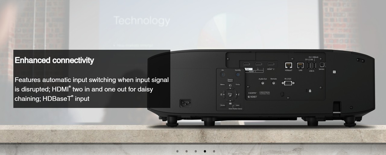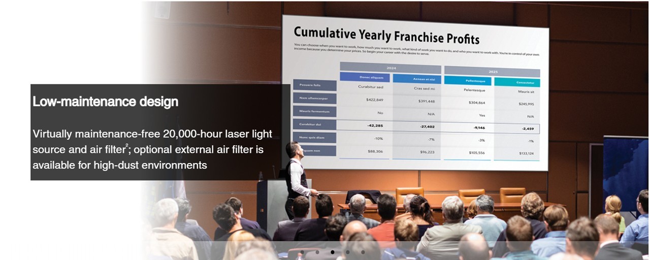 The EB-PQ2010B features a virtually maintenance-free 20,000-hour laser light source and air filter. The projector provides frame interpolation for fast-moving objects, as well as HDR support and scene adaptive gamma correction for lifelike images. The EB-PQ2010B pairs with 10 optional powered lenses (sold separately) to simplify installation and includes a host of premium features for fast setup, such as built-in NFC functionality, and an optional attachable PixAlign™ camera to streamline multi-projector setups.8,000 lumens of equal white and color brightness