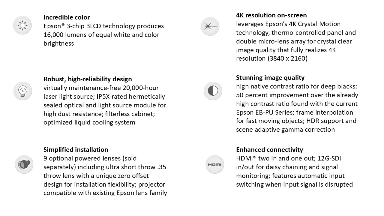 Designed for fixed installation applications and to meet the rigorous demands of live events, the EB-PQ2216B features a filterless cabinet, IP5X-rated hermetically sealed optical and light source unit, and a virtually maintenance-free 20,000-hour laser light source. The projector provides frame interpolation for fast-moving objects, as well as HDR support and scene adaptive gamma correction for lifelike images. The EB-PQ2216B pairs with 9 optional powered lenses (sold separately) to simplify installation and includes a host of premium features for fast setup, such as built-in NFC functionality, and an optional attachable PixAlign™camera to streamline multi-projector setups.