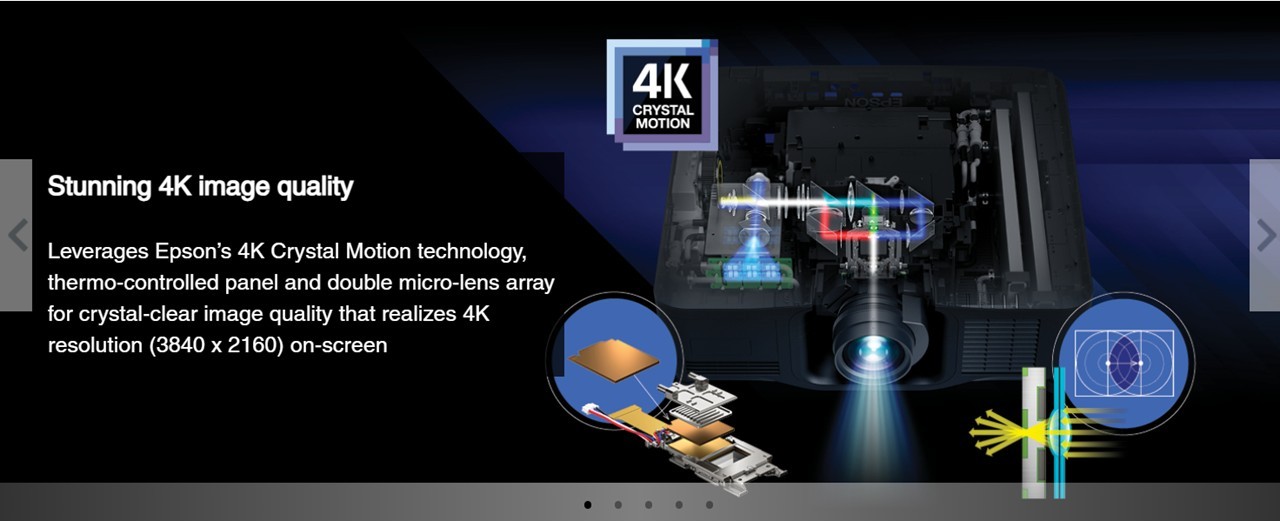 Leveraging our 4K Crystal Motion technology, thermo-control panel and double micro-lens array, the EB-PQ2216B laser projector delivers stunning 4K resolution on-screen. With 16,000 lumens of color and white brightness, the EB-PQ2216B produces captivating visuals in extraordinary detail. And a high native contrast ratio and 3-chip 3LCD technology means you will enjoy a realistic display enriched with vibrant colors and deep blacks.