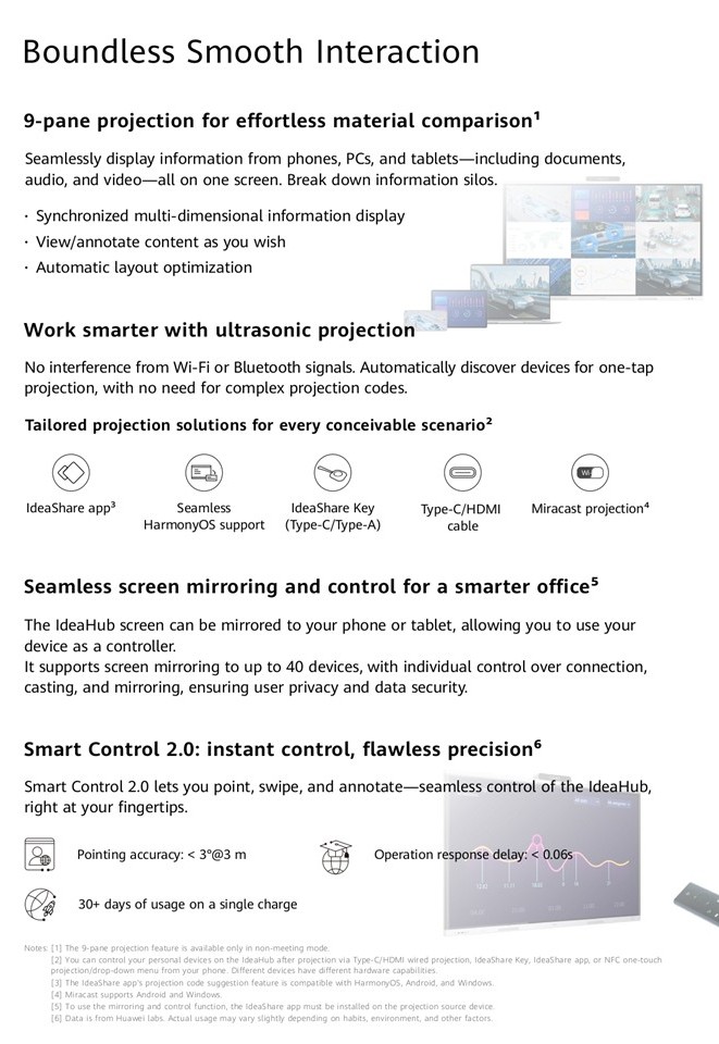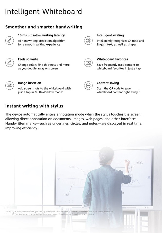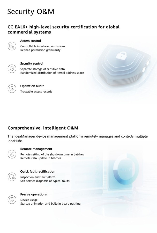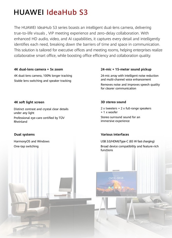 The HUAWEI IdeaHub S3 series boasts an intelligent dual-lens camera, delivering true-to-life visuals , VIP meeting experience and zero-delay collaboration. With enhanced HD audio, video, and AI capabilities, it captures every detail and intelligently identifies each need, breaking down the barriers of time and space in communication. This solution is tailored for executive offices and meeting rooms, helping enterprises realize collaborative smart office, while boosting office efficiency and collaboration quality.