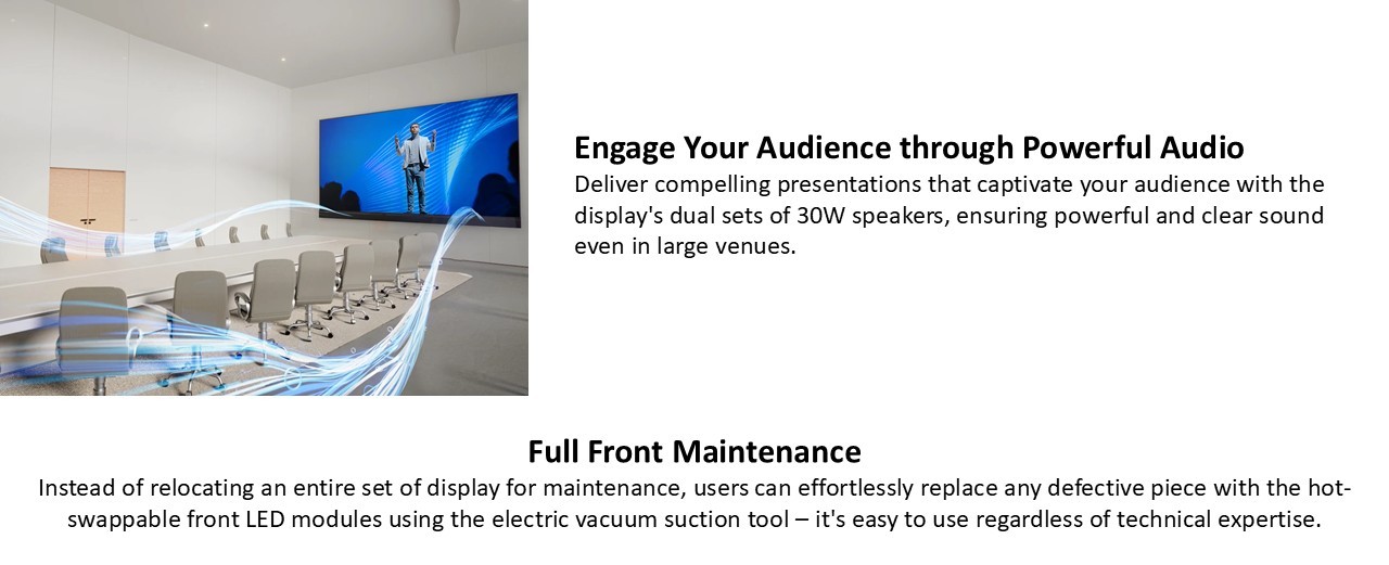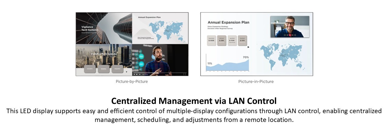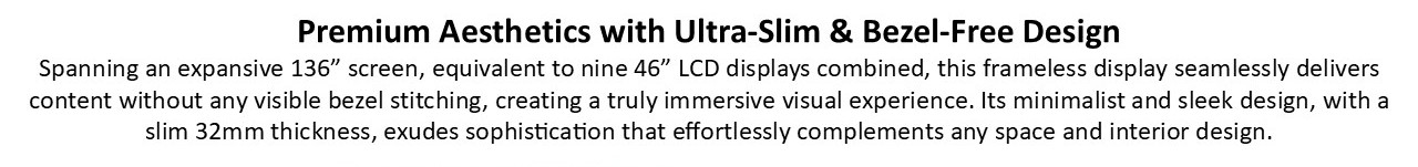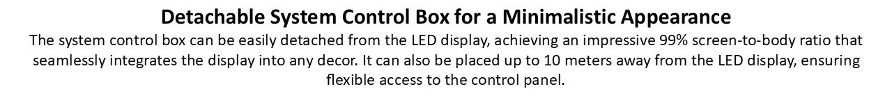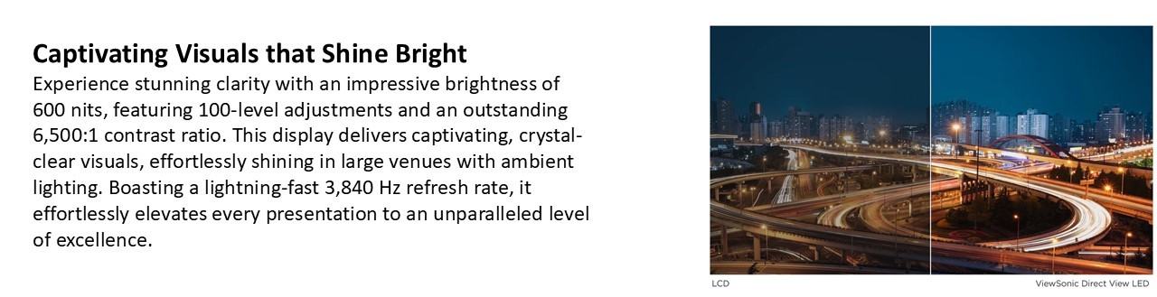 The ViewSonic LDM136-151 is a cutting-edge 136” All-in-One LED display designed to elevate visual and auditory experiences in high-end corporate and educational environments. Boasting an impressive 600-nit brightness, a high 6,500:1 contrast ratio, and a 3,840Hz refresh rate, complemented by dual 30W speakers, it ensures exceptional clarity and immersive audio for every video, presentation, or lecture. The All-in-One display features a user-friendly design for a simplified installation experience. It also utilizes the Glue-on-Board (GOB) surface treatment technology, achieving an IP54 rating for enhanced protection from collisions, dust, and moisture. Featuring a 31mm ultra-slim design and 6mm thin bezels, the display offers a premium aesthetic and ensures an engaging viewing experience. Additionally, the detachable control box enables it to achieve a nearly 99% screen-to-body ratio, seamlessly integrating into any space while providing easy accessibility. Moreover, it supports PIP/PBP display and wireless casting capabilities, offering more flexibility for collaboration. Adding to its convenience, compatibility with AV control systems enables IT staff to remotely configure the display.