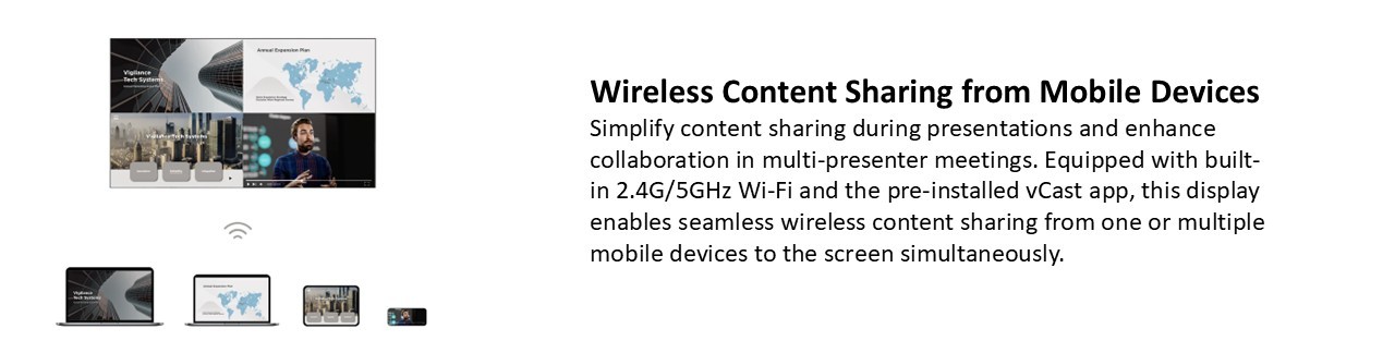 HDMI: 4 (HDMI 2.0/HDCP 2.2) (internal x3, external x1) USB Type A: 3 (USB3.0 x1, USB2.0 x2) RJ45 Input (Internet): 3 (internet x2, control x1) IR in (3.5mm): 1 Wi-Fi Input: 2.4G/5G Hz USB Type C: 1 (data only) |