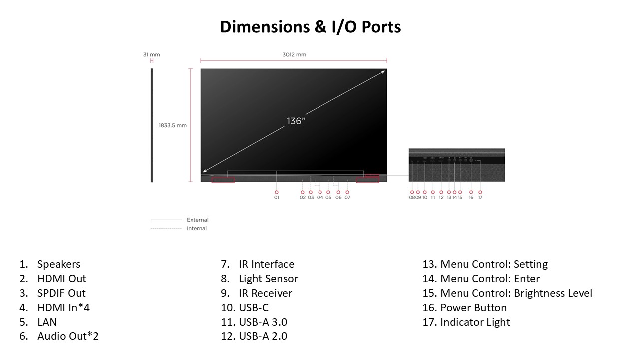 Power Supply Voltage: 100-120V/20A ~ 50/60Hz or 220-240V/10A ~ 50Hz (vary by country) Power Consumption: 609W (typ), 1740W (max) < 0.5W (Hibernate) Operating Temperature: 0~40℃ Total LED Module Quantity: 100 Ingress Protection Rating: IP54(Front) Impact Protection Rating: IK06(Front) Net Weight: 357.14 lbs (162 kg) Gross Weight: 668 lbs (303kg) Product Dimensions (WxHxD): 118.58 x 72.19 x1.2 inches (3012 x 1833.5 x 31mm) Product Dimensions (WxHxD) with wall mount: 118.58 x 72.19 x 2.1 inches (3012 x 1833.5 x 53mm) Packing Dimensions (WxHxD): 77.95 x 42.28 x 39.37 inches |