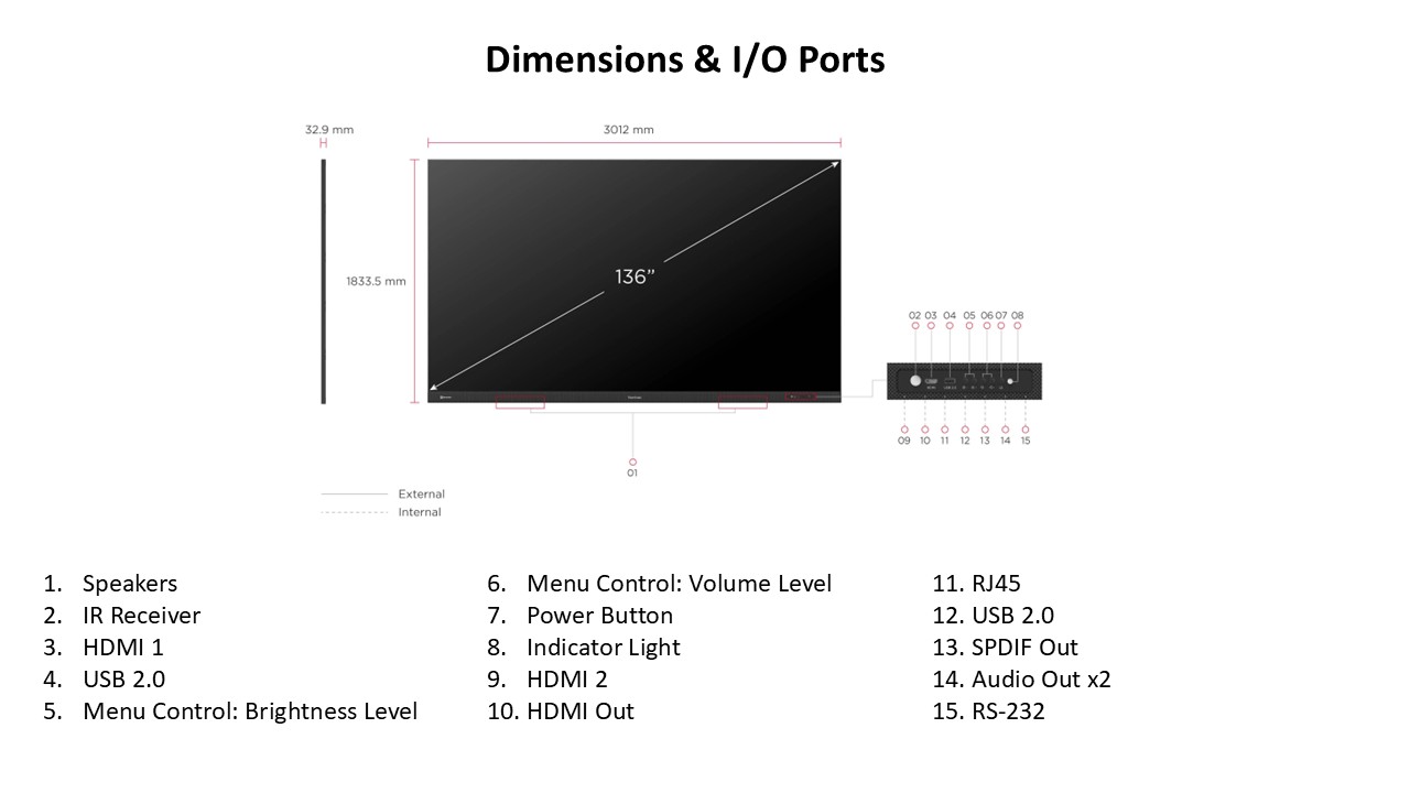 Power Supply Voltage: 100-120V/20A ~ 50/60Hz or 220-240V/10A ~ 50Hz (vary by country) Power Consumption: 570W (typ), 1710W (max) < 0.5W (Hibernate) Operating Temperature: 0~40℃ Total LED Module Quantity: 100 Ingress Protection Rating: IP54(Front) Impact Protection Rating: IK06(Front) Net Weight: 330.69lbs (150 kg) Gross Weight: 529.11 lbs (240 kg) Product Dimensions (WxHxD): 118.58 x 69.82 x 3.56 inches (3012 x 1773.4 x 90.5mm) Product Dimensions (WxHxD) with wall mount: 118.58 x 69.82 x 3.56 inches (3012 x 1773.4 x 90.5mm) Packing Dimensions (WxHxD): 78.35 x 34.65 x 48.03 inches (1990 x 880 x 1220mm) |