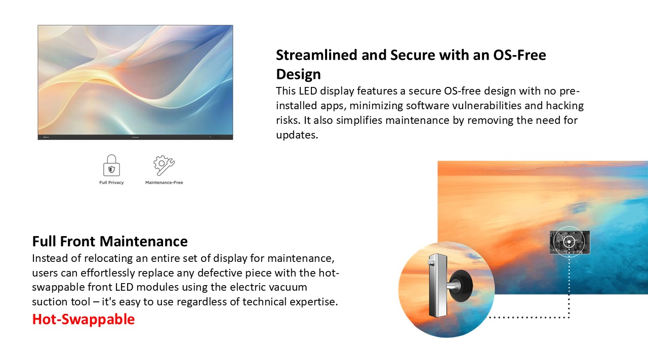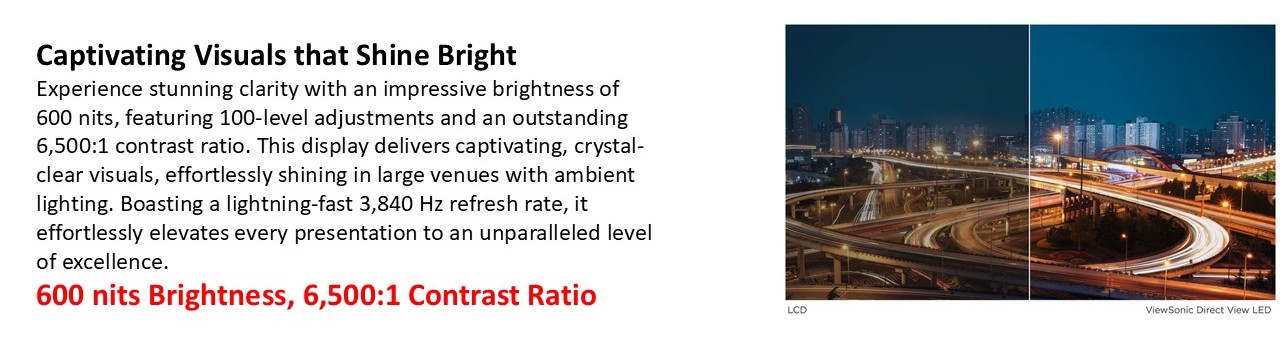 The ViewSonic LDM136G-152 is a 136-inch All-in-One LED display designed for large corporate and education environments. With 600 nits of brightness, a 6,500:1 contrast ratio, and dual 18W speakers, it delivers sharp visuals and powerful audio for meetings, lectures, and presentations. Engineered with Glue-on-Board (GOB) surface treatment, the display offers enhanced durability against impact, dust, and moisture, achieving IP54 and IK06 ratings for added reliability in high-traffic areas. Smart power redundancy ensures uninterrupted performance by automatically switching to a backup power source when needed. All-in-One integration simplifies installation, allowing two people to complete setup in under two hours while minimizing labor and downtime. Its 32mm ultra-slim profile and 7mm bezels create a sleek, modern aesthetic that complements any space. With no built-in operating system, the LDM136G-152 reduces cybersecurity risks and eliminates ongoing software maintenance, making it a secure, low-maintenance solution for professional LED video wall installations.