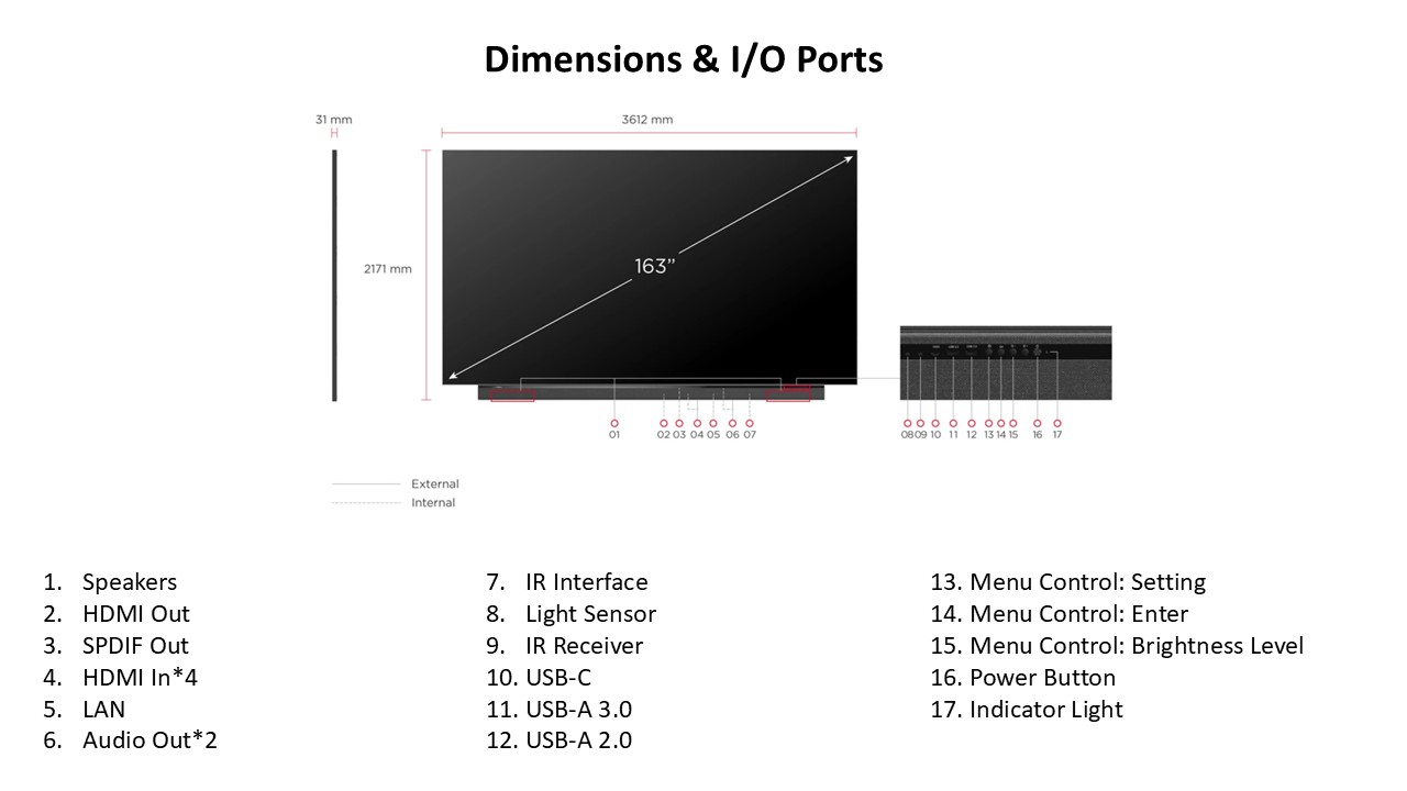 Product Dimensions (WxHxD) with wall mount: 142.2 x 85.47 x 2.1 inches (3612 x 2171 x 53mm)