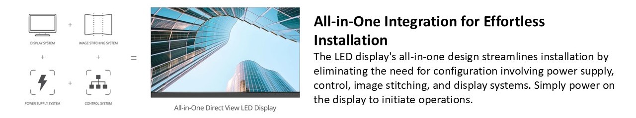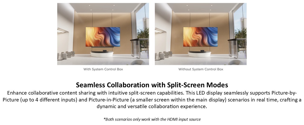 The ViewSonic LDM163-182 is a cutting-edge 163” All-in-One LED display designed to elevate visual and auditory experiences in high-end corporate and educational environments. Boasting an impressive 600-nit brightness, a high 6,500:1 contrast ratio, and a 3,840Hz refresh rate, complemented by dual 30W speakers, it ensures exceptional clarity and immersive audio for every video, presentation, or lecture. The All-in-One display features a user-friendly design for a simplified installation experience. It also utilizes the Glue-on-Board (GOB) surface treatment technology, achieving an IP54 rating for enhanced protection from collisions, dust, and moisture. Featuring a 31mm ultra-slim design and 6mm thin bezels, the display offers a premium aesthetic and ensures an engaging viewing experience. Additionally, the detachable control box enables it to achieve a nearly 99% screen-to-body ratio, seamlessly integrating into any space while providing easy accessibility. Moreover, it supports PIP/PBP display and wireless casting capabilities, offering more flexibility for collaboration. Adding to its convenience, compatibility with AV control systems enables IT staff to remotely configure the display.