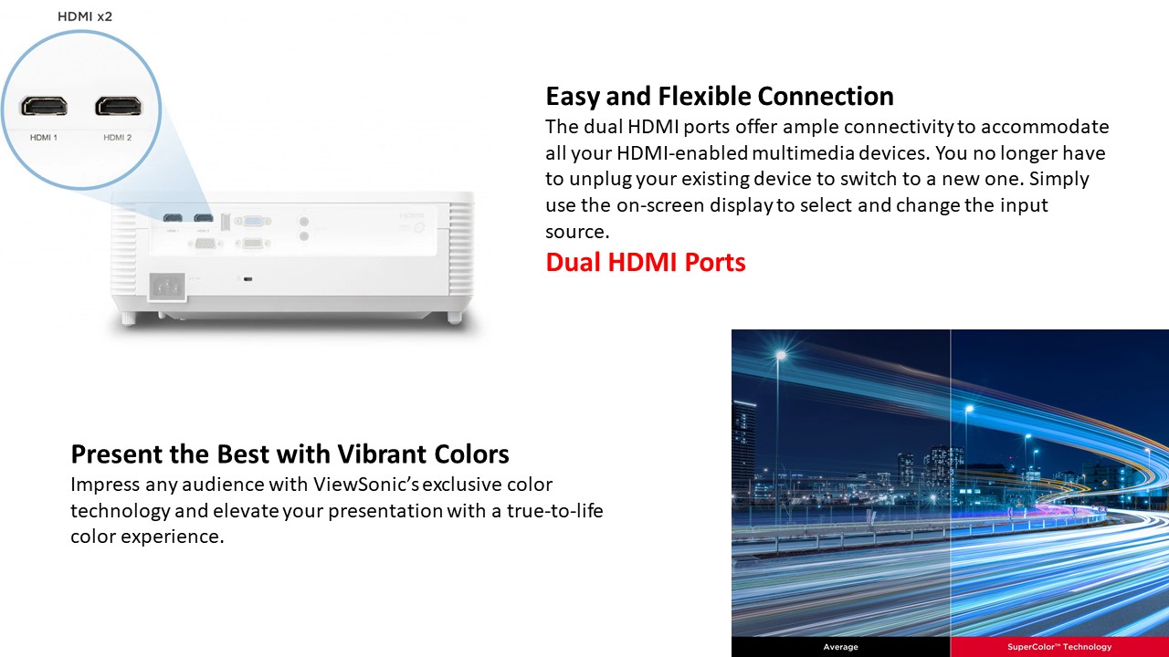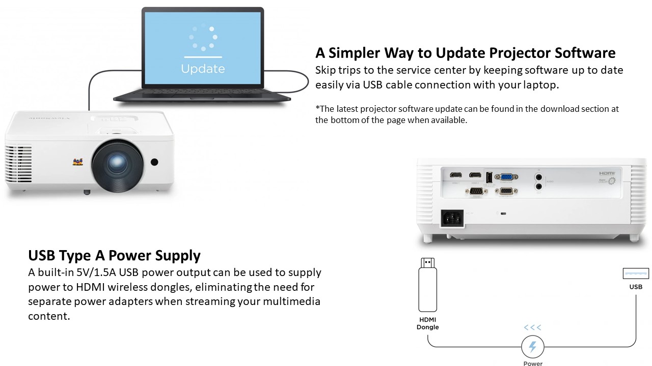 The PA700W is ViewSonic’s high brightness XGA business/education projector. With 4,500 ANSI Lumens of high brightness, the projector offers clear images of up-to-300” large screen in meeting rooms, classrooms, or any other bright environment. The dual HDMI ports allow you to flexibly connect to multiple devices, easily switching between content sources. The USB Type-A port can supply power to HDMI wireless dongles, making wireless content streaming more convenient. The projector also allows software updates via USB cable connection with simply your laptops, skipping trips to service centers.