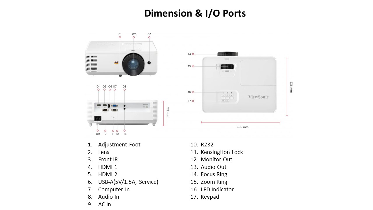 Power Cord: 1 VGA Cable: 1 Remote Control: 1 QSG: Yes Air Filter: Yes (CN Only) Warranty Card: Yes (CN Only) |