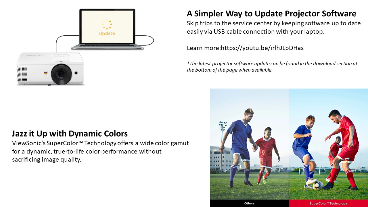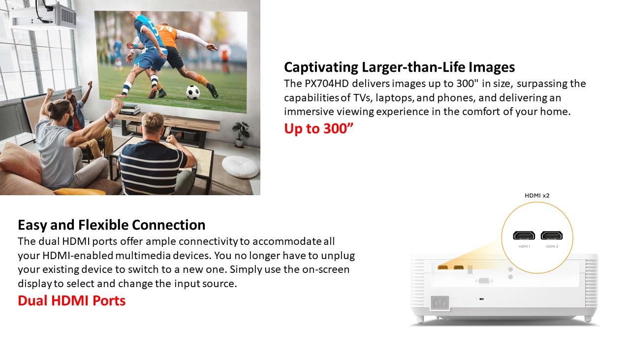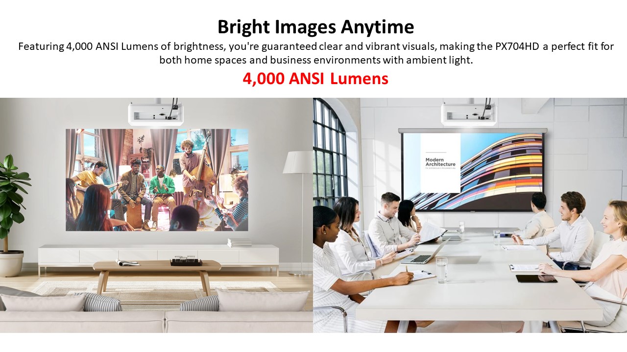 The PX704HD is a 4,000 ANSI Lumens lamp projector ideal for home and business use. Featuring a 1080p FHD resolution and up to 300” ultra-large projection, it showcases clear and vivid visuals for home entertainment and presentations. With a high native contrast ratio achieved through its 0.65” DMD chip, this projector showcases captivating visuals even with low-light movie scenes. It offers two HDMI ports for easy multimedia connectivity. Designed for enhanced functionality, it includes a USB-A output to power HDMI wireless dongles, eliminating the need for extra adapters. Whether tilted up or down, the auto V keystone feature ensures automatic image correction, keeping perfectly-aligned visuals. Maintenance is hassle-free – simply use a laptop and USB cable for software updates.